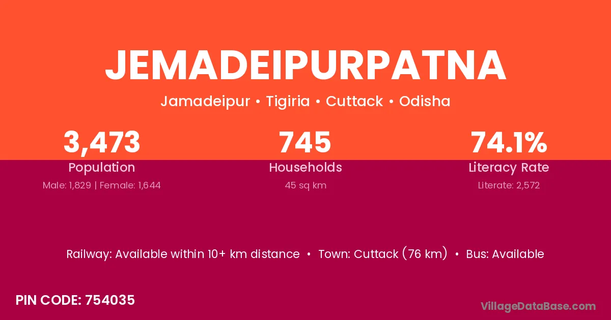 Jemadeipurpatna village has a total population of 3,473 people, of which 1,829 are males and 1,644 are females.