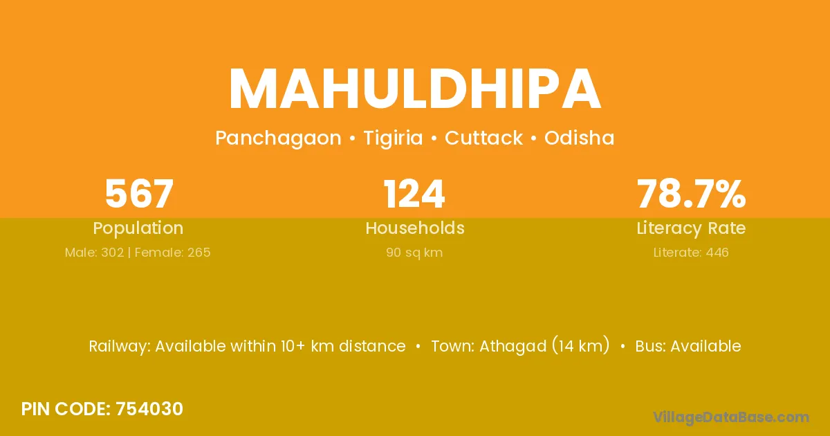 Athagad (14 km) is the nearest town to Mahuldhipa village for major economic activities and is located approximately 14 km away.