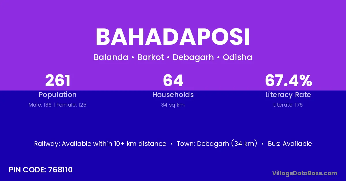 Debagarh (34 km) is the nearest town to Bahadaposi village for major economic activities and is located approximately 34 km away.