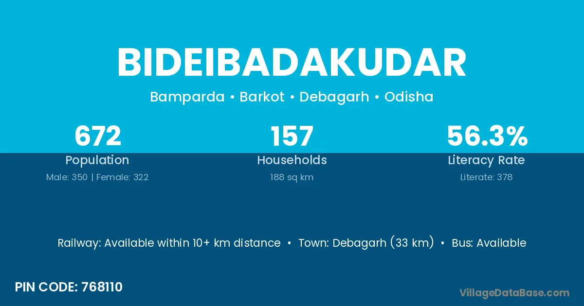Debagarh (33 km) is the nearest town to Bideibadakudar village for major economic activities and is located approximately 33 km away.