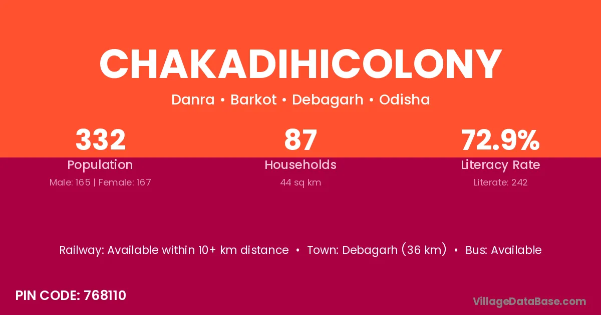 Debagarh (36 km) is the nearest town to Chakadihicolony village for major economic activities and is located approximately 36 km away.