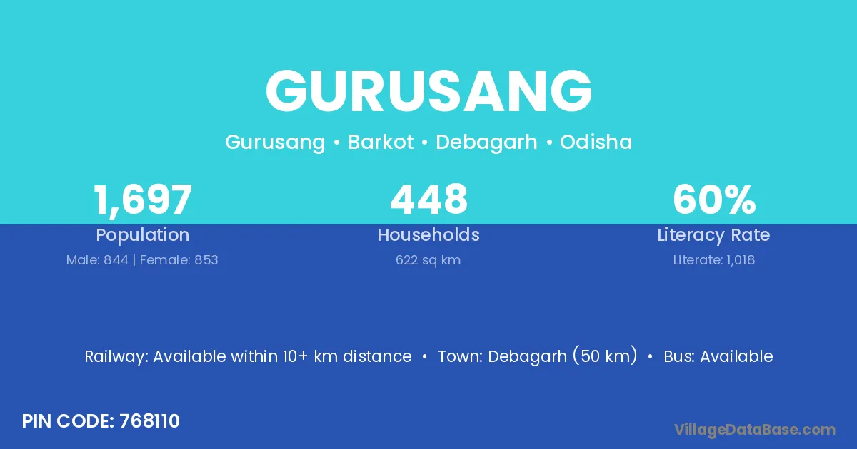 Debagarh (50 km) is the nearest town to Gurusang village for major economic activities and is located approximately 50 km away.