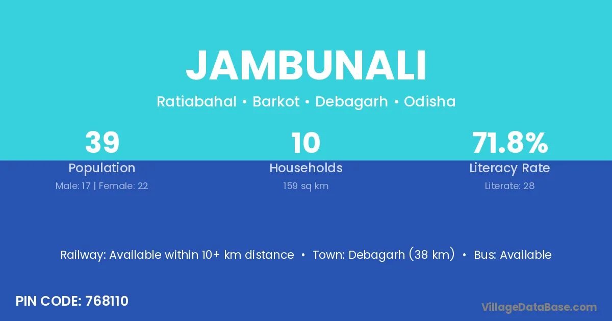 Debagarh (38 km) is the nearest town to Jambunali village for major economic activities and is located approximately 38 km away.