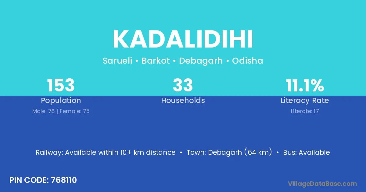 Debagarh (64 km) is the nearest town to Kadalidihi village for major economic activities and is located approximately 64 km away.