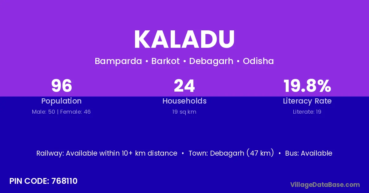 Debagarh (47 km) is the nearest town to Kaladu village for major economic activities and is located approximately 47 km away.