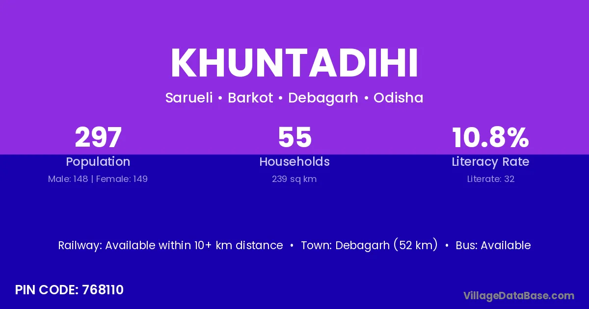 Khuntadihi village has a total population of 297 people, of which 148 are males and 149 are females.