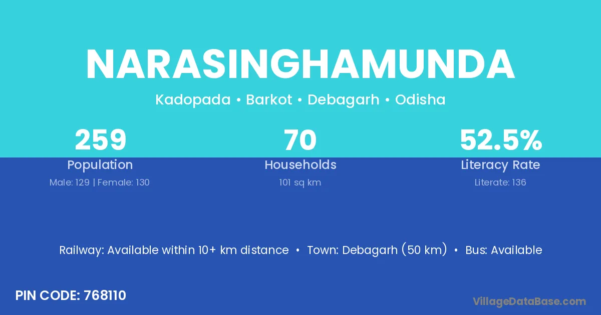 Debagarh (50 km) is the nearest town to Narasinghamunda village for major economic activities and is located approximately 50 km away.