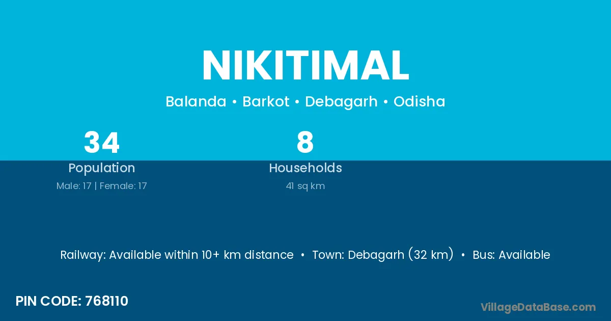 Debagarh (32 km) is the nearest town to Nikitimal village for major economic activities and is located approximately 32 km away.