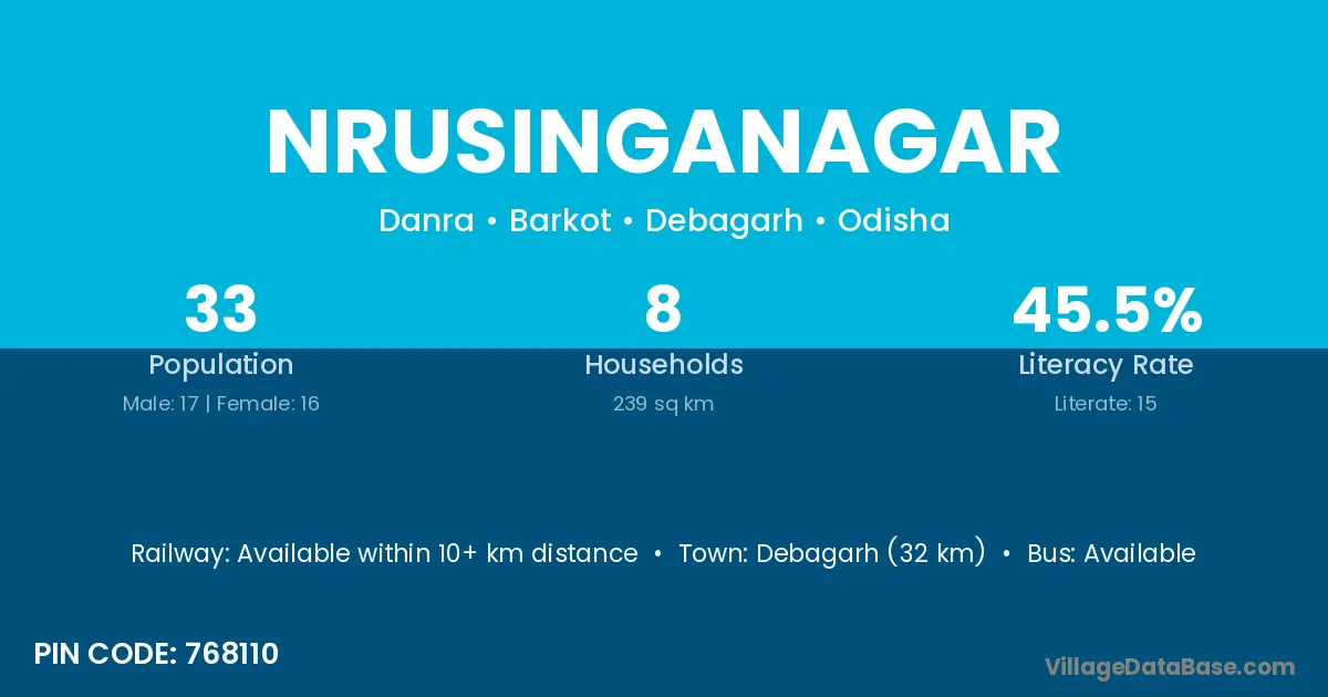 Debagarh (32 km) is the nearest town to Nrusinganagar village for major economic activities and is located approximately 32 km away.