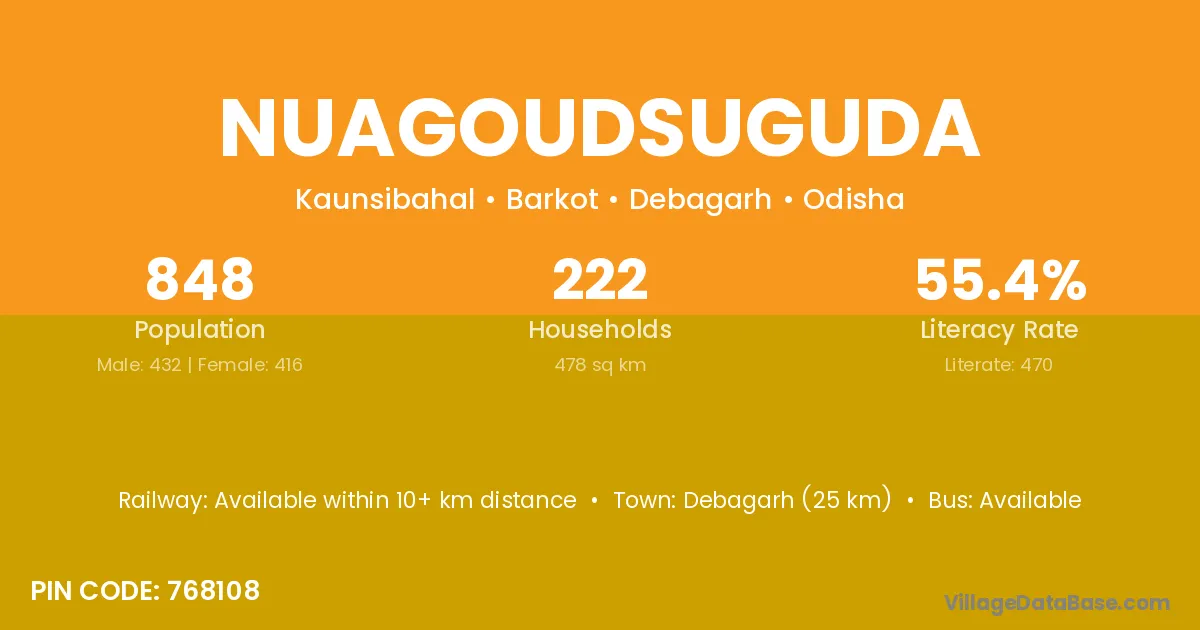 Debagarh (25 km) is the nearest town to Nuagoudsuguda village for major economic activities and is located approximately 25 km away.