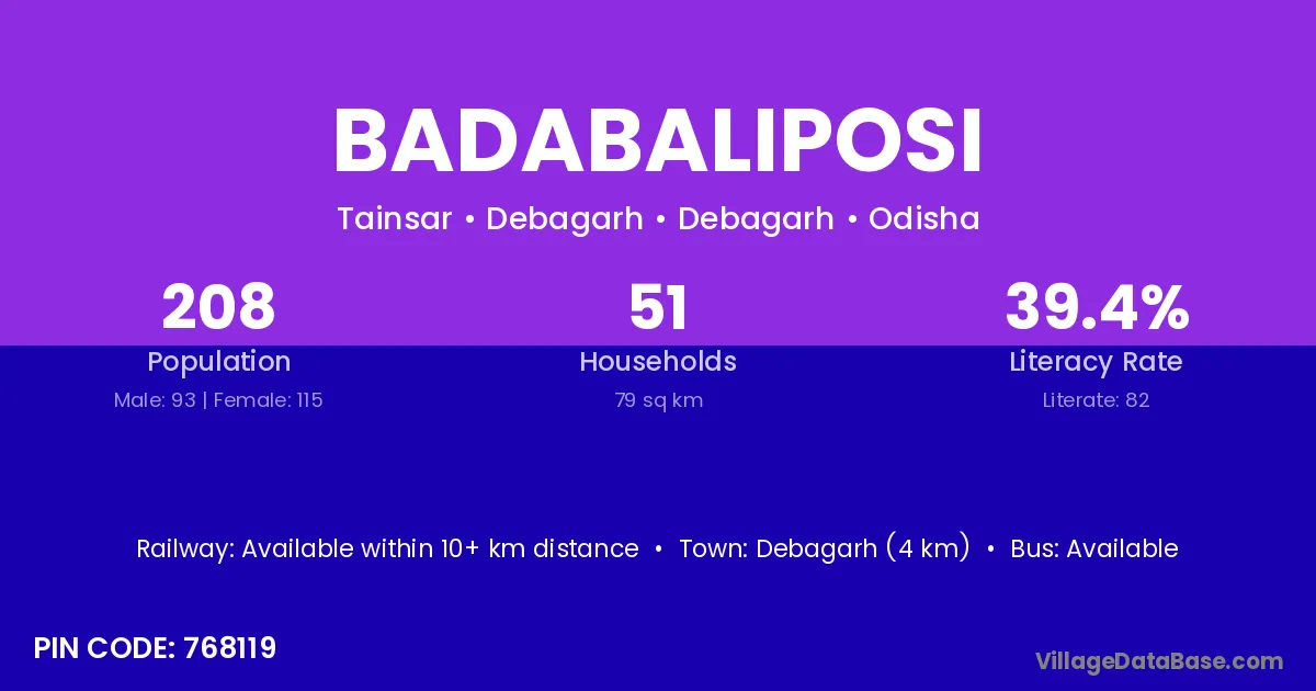 Debagarh (4 km) is the nearest town to Badabaliposi village for major economic activities and is located approximately 4 km away.