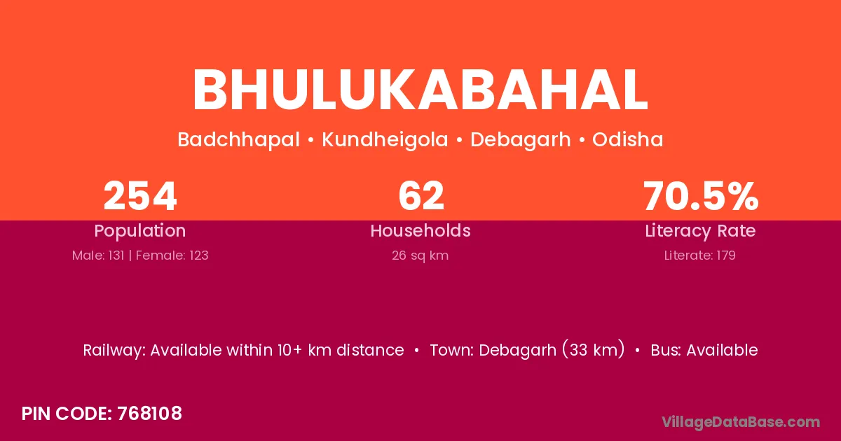 Debagarh (33 km) is the nearest town to Bhulukabahal village for major economic activities and is located approximately 33 km away.
