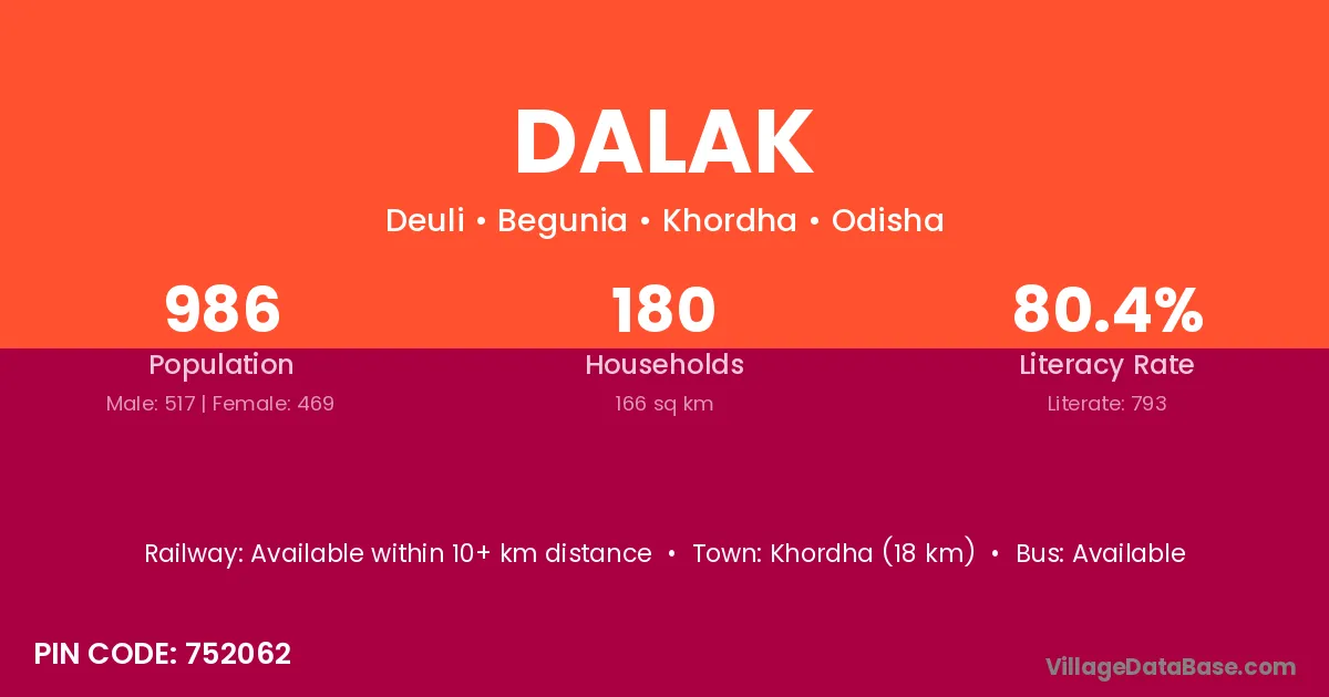 Anugul (58 km) is the nearest town to Dalak village for major economic activities and is located approximately 58 km away.