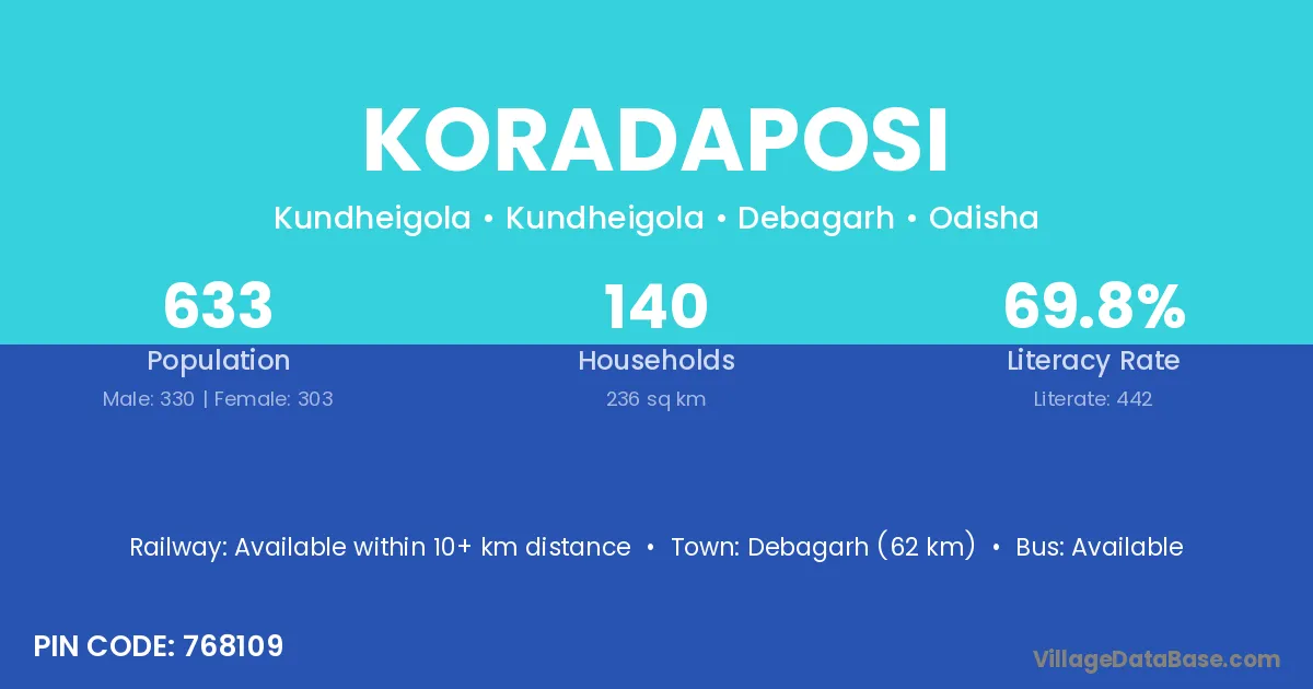 Debagarh (62 km) is the nearest town to Koradaposi village for major economic activities and is located approximately 62 km away.