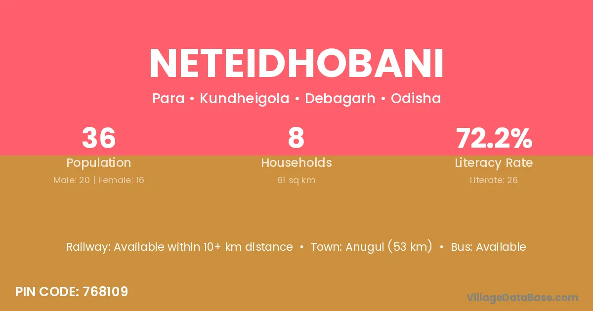 Anugul (53 km) is the nearest town to Neteidhobani village for major economic activities and is located approximately 53 km away.