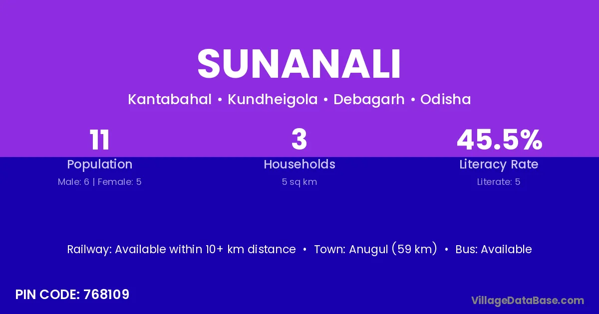 Anugul (59 km) is the nearest town to Sunanali village for major economic activities and is located approximately 59 km away.