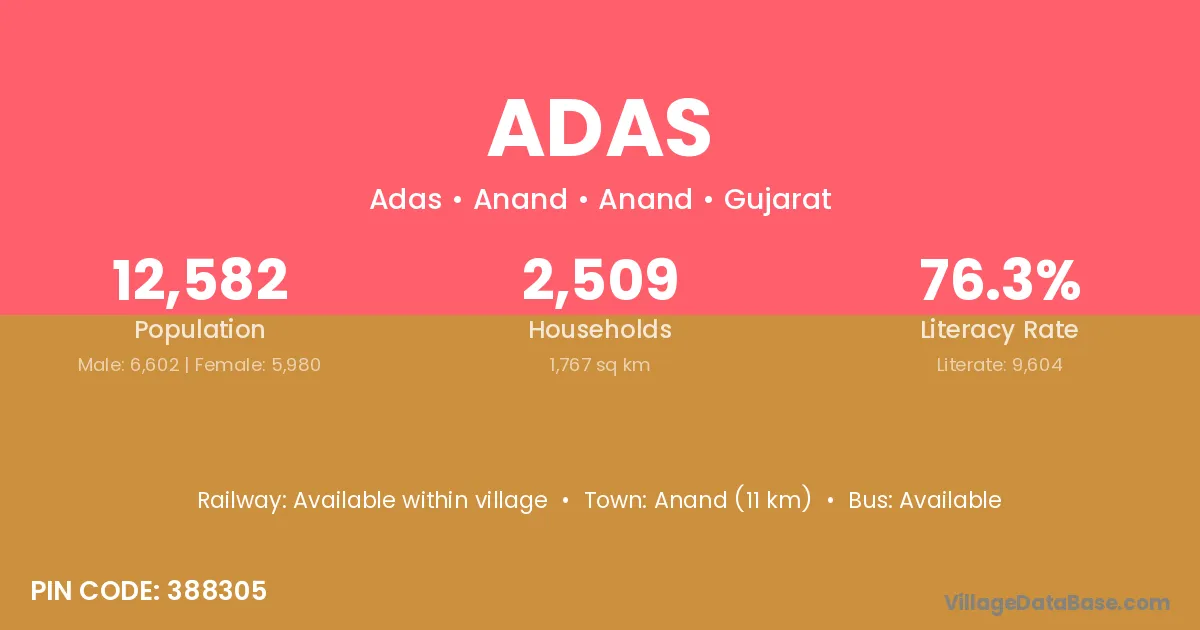 The literacy rate of Adas village is 72.84%. Male literacy stands at 86.34% and female literacy at 60.34%.