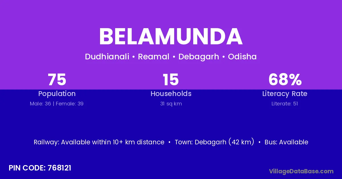 Debagarh (42 km) is the nearest town to Belamunda village for major economic activities and is located approximately 42 km away.
