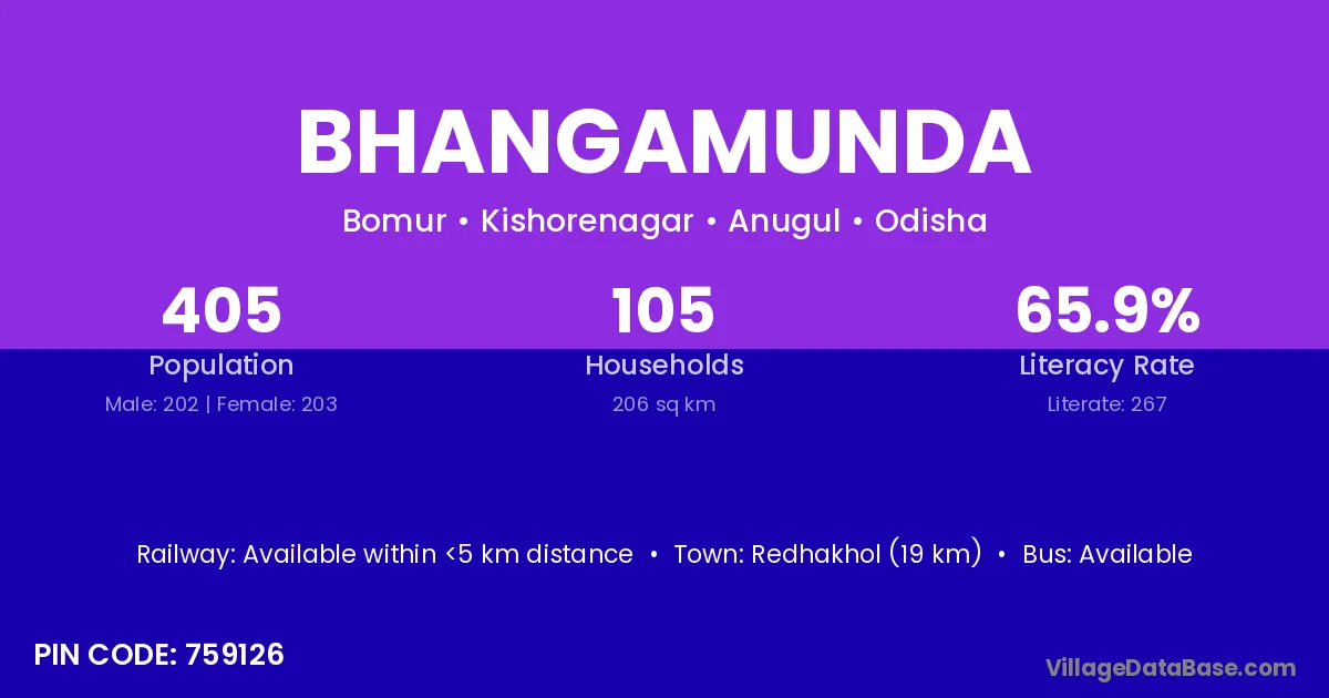 The literacy rate of Bhangamunda village is 71.60%. Male literacy stands at 82.50% and female literacy at 60.98%.