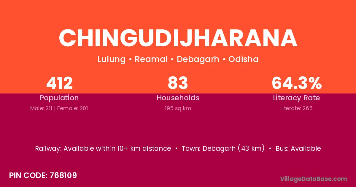 Debagarh (43 km) is the nearest town to Chingudijharana village for major economic activities and is located approximately 43 km away.
