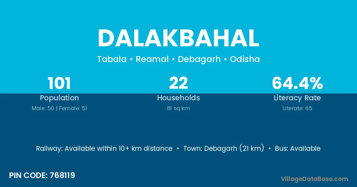 Debagarh (21 km) is the nearest town to Dalakbahal village for major economic activities and is located approximately 21 km away.