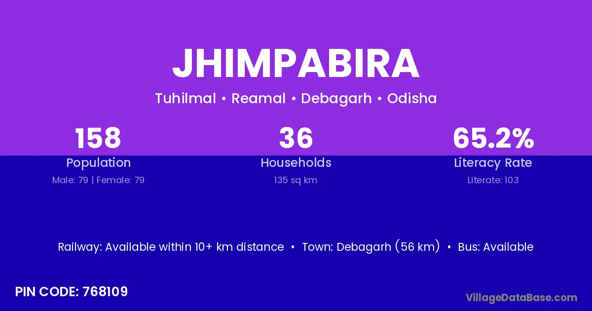 Debagarh (56 km) is the nearest town to Jhimpabira village for major economic activities and is located approximately 56 km away.