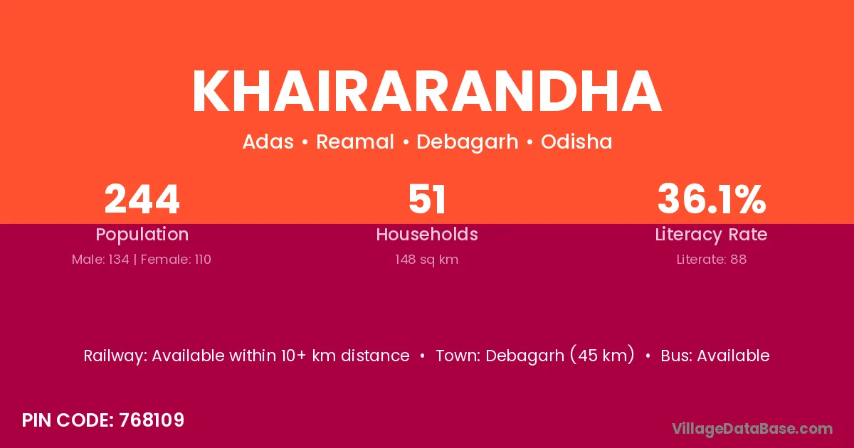 Debagarh (45 km) is the nearest town to Khairarandha village for major economic activities and is located approximately 45 km away.