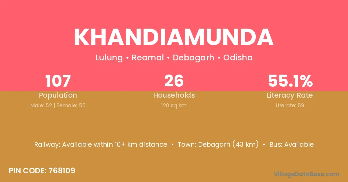 Debagarh (43 km) is the nearest town to Khandiamunda village for major economic activities and is located approximately 43 km away.