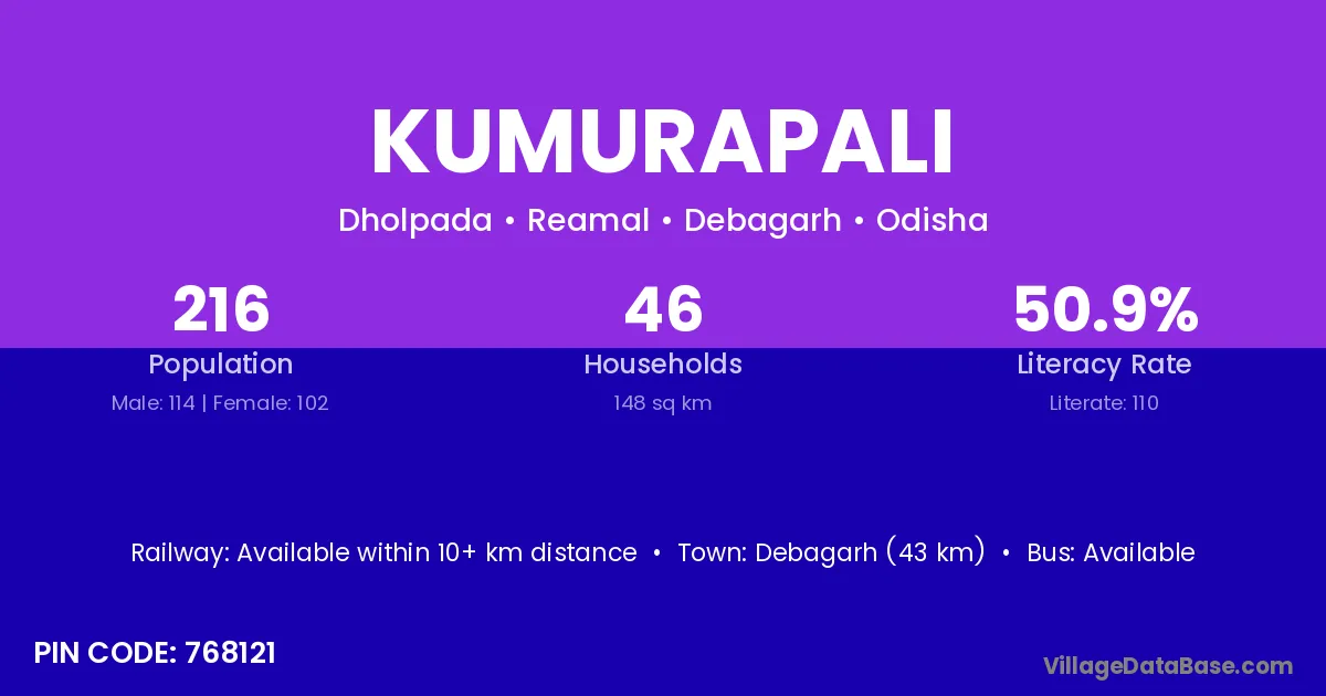 Kumurapali village has a total population of 216 people, of which 114 are males and 102 are females.