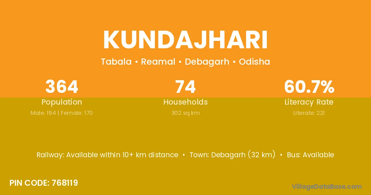 Debagarh (32 km) is the nearest town to Kundajhari village for major economic activities and is located approximately 32 km away.