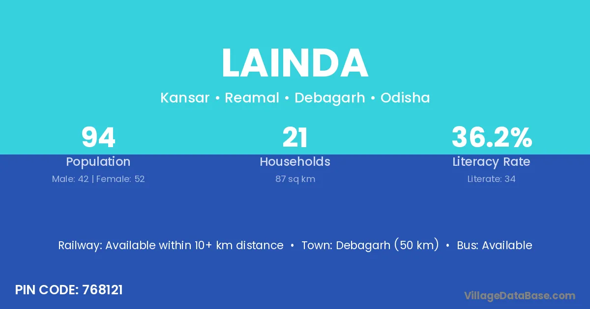 Debagarh (50 km) is the nearest town to Lainda village for major economic activities and is located approximately 50 km away.