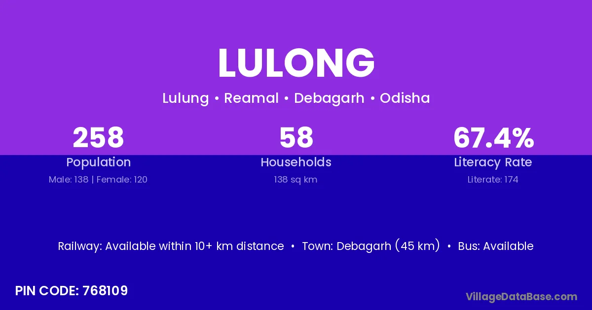 Debagarh (45 km) is the nearest town to Lulong village for major economic activities and is located approximately 45 km away.