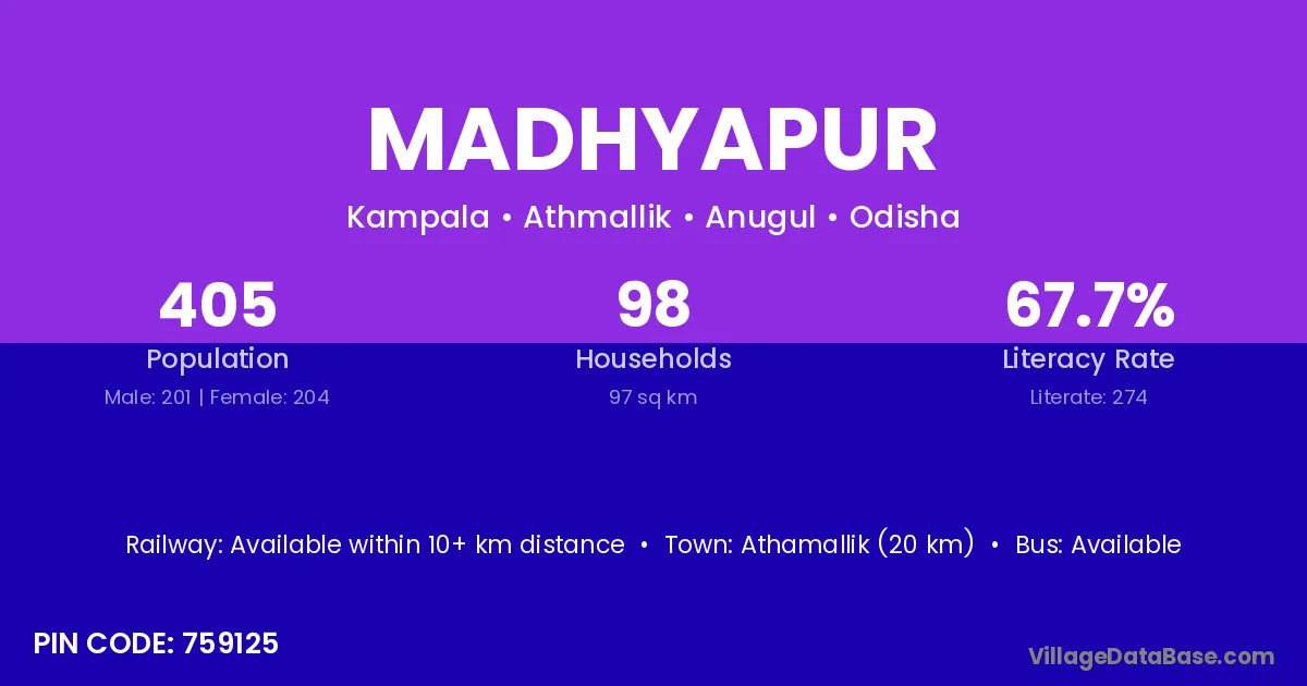 Debagarh (30 km) is the nearest town to Madhyapur village for major economic activities and is located approximately 30 km away.