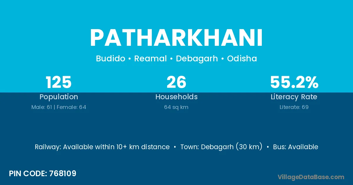 Debagarh (30 km) is the nearest town to Patharkhani village for major economic activities and is located approximately 30 km away.