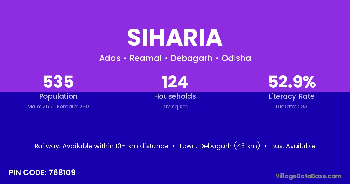 Debagarh (43 km) is the nearest town to Siharia village for major economic activities and is located approximately 43 km away.