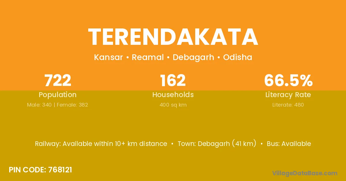Debagarh (41 km) is the nearest town to Terendakata village for major economic activities and is located approximately 41 km away.