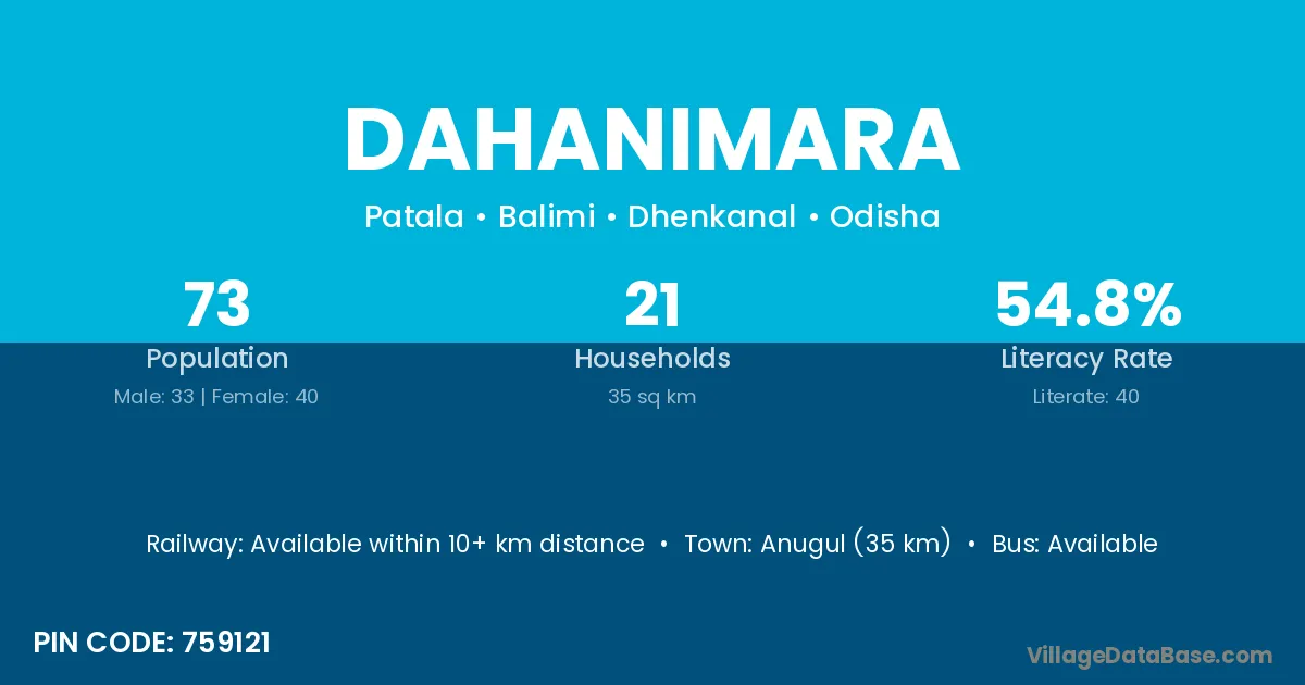 Anugul (35 km) is the nearest town to Dahanimara village for major economic activities and is located approximately 35 km away.