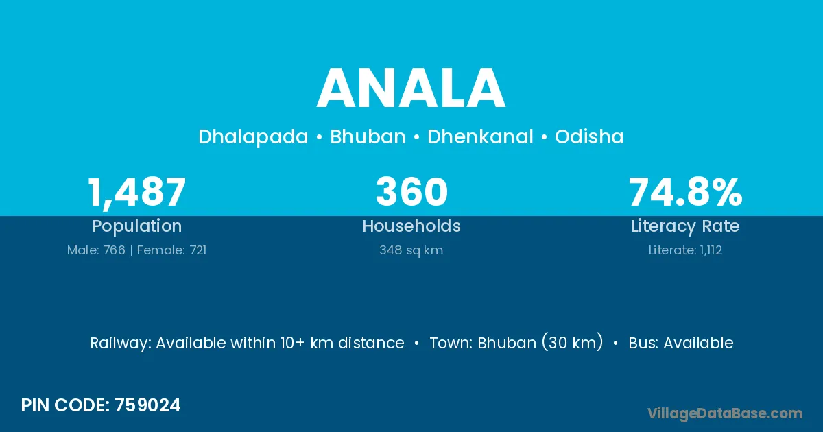Bhuban (30 km) is the nearest town to Anala village for major economic activities and is located approximately 30 km away.