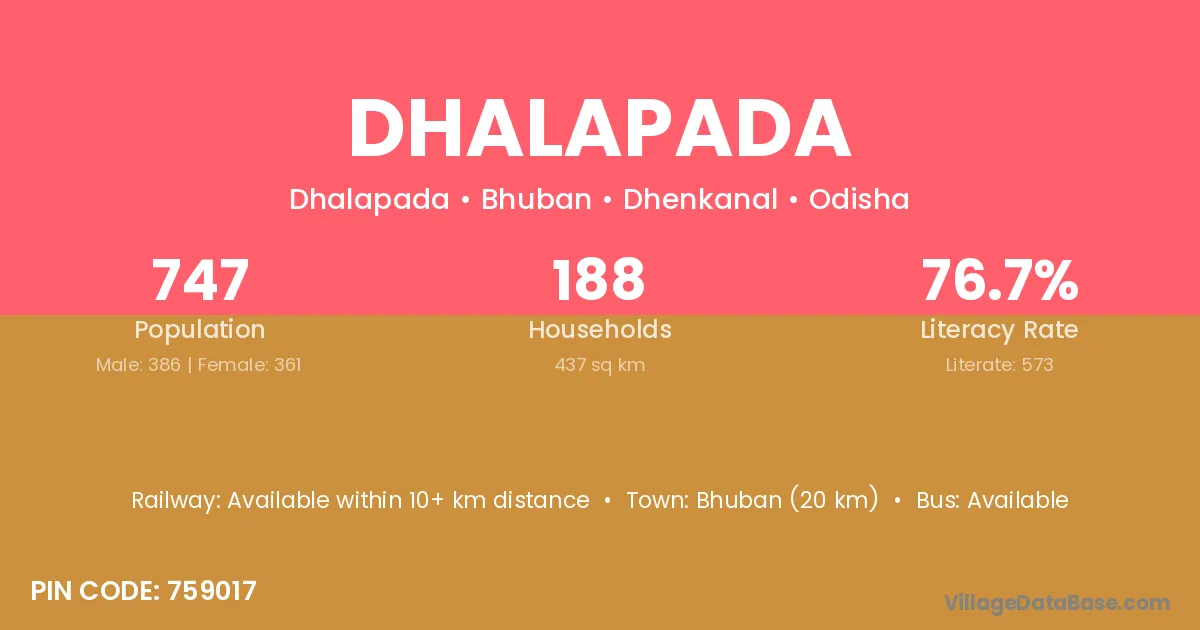 Bhuban (20 km) is the nearest town to Dhalapada village for major economic activities and is located approximately 20 km away.