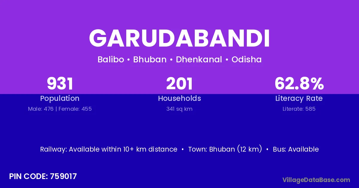 Garudabandi village has a total population of 931 people, of which 476 are males and 455 are females.