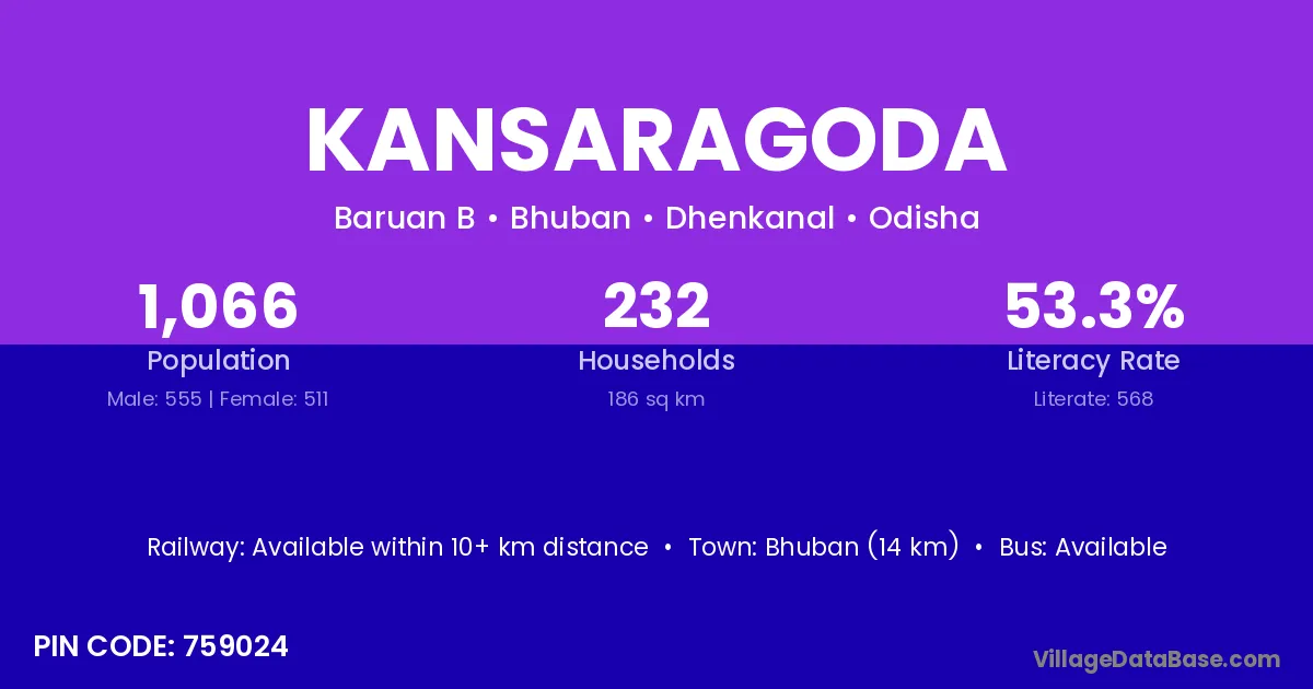 Bhuban (14 km) is the nearest town to Kansaragoda village for major economic activities and is located approximately 14 km away.