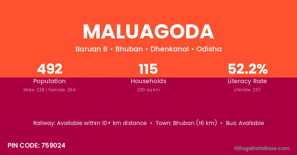 Bhuban (16 km) is the nearest town to Maluagoda village for major economic activities and is located approximately 16 km away.