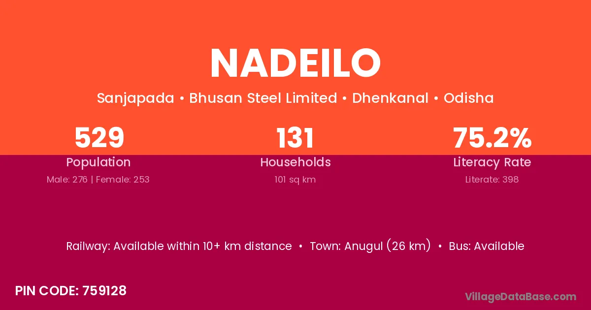 Anugul (26 km) is the nearest town to Nadeilo village for major economic activities and is located approximately 26 km away.
