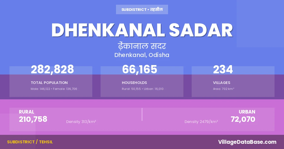 According to the 2011 census The total area of Dhenkanal Sadar Tehsil is 702 km², with a population of 282828 people. The population density is 403 inhabitants per square kilometre, and there are approximately 66165 houses in the sub district.