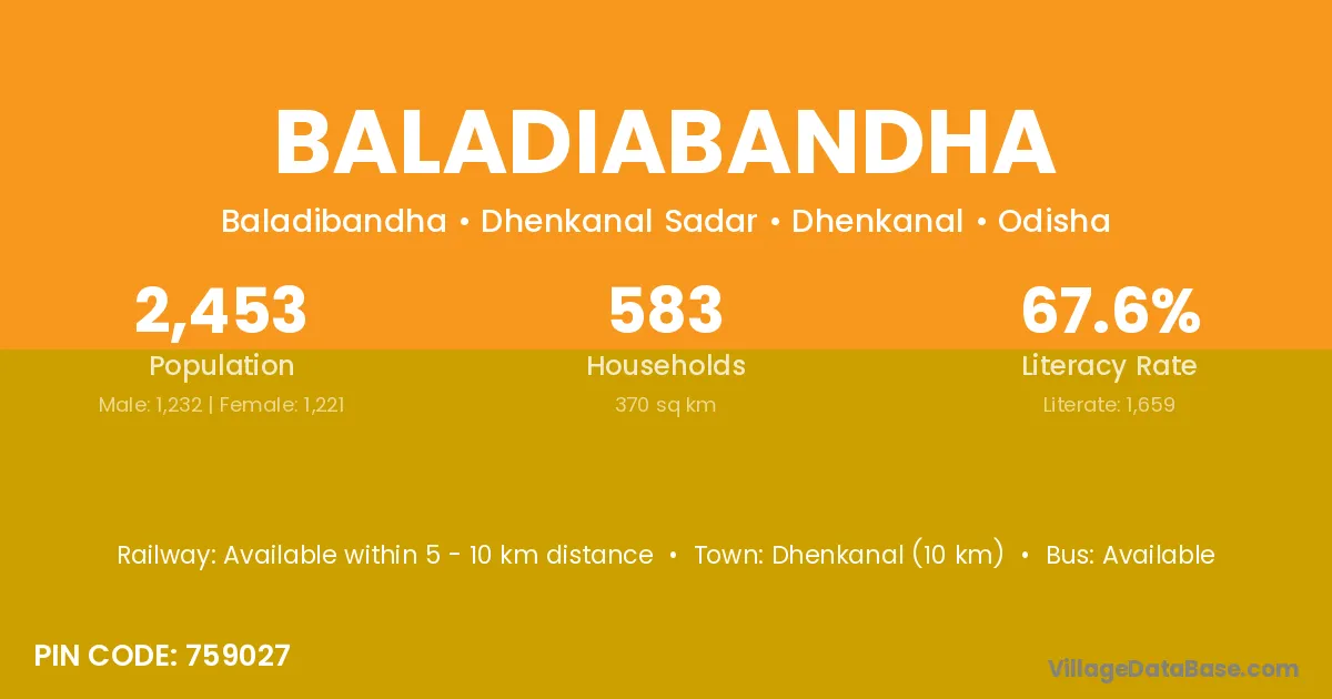 Baladiabandha village has a total population of 2,453 people, of which 1,232 are males and 1,221 are females.