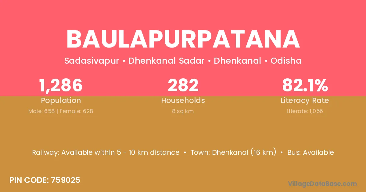 Dhenkanal (16 km) is the nearest town to Baulapurpatana village for major economic activities and is located approximately 16 km away.