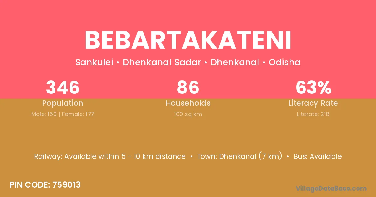 Dhenkanal (7 km) is the nearest town to Bebartakateni village for major economic activities and is located approximately 7 km away.