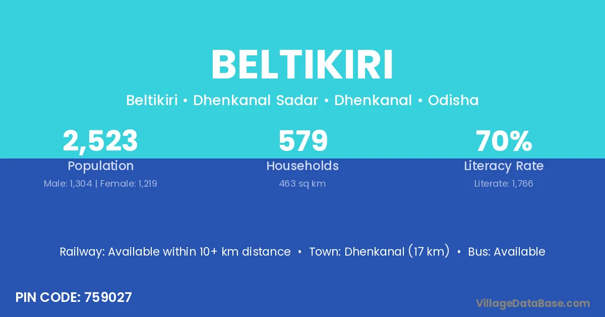 Dhenkanal (17 km) is the nearest town to Beltikiri village for major economic activities and is located approximately 17 km away.