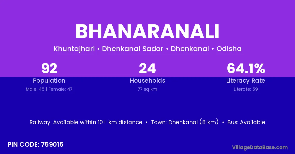 Dhenkanal (8 km) is the nearest town to Bhanaranali village for major economic activities and is located approximately 8 km away.