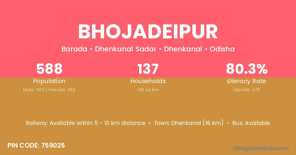 Dhenkanal (16 km) is the nearest town to Bhojadeipur village for major economic activities and is located approximately 16 km away.